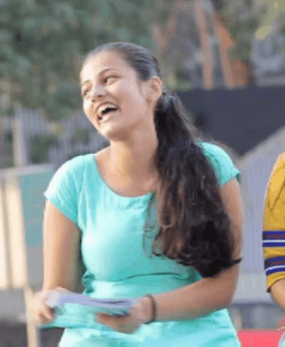 Paglalarawan ng Content: a woman in a blue shirt is laughing and smiling