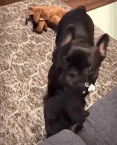 Paglalarawan ng Content: two black dogs are standing next to each other on a couch in a living room .