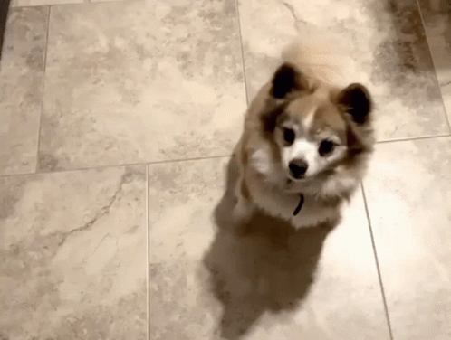 Paglalarawan ng Content: a small brown and white dog is sitting on a tiled floor .