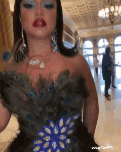 Paglalarawan ng Content: a woman in a peacock feathered dress is standing in a hallway with a caption that says cucumber cats