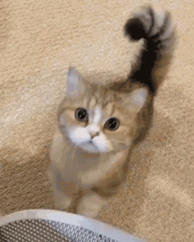 Paglalarawan ng Content: a small cat with a long tail is standing on a carpet looking up at the camera .