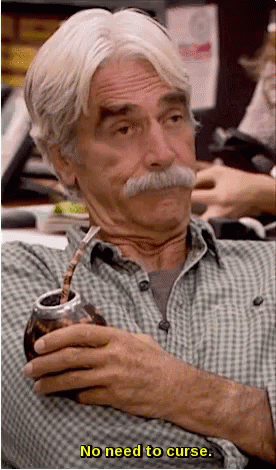 Paglalarawan ng Content: a man with a mustache is holding a drink and the words no need to curse are above him