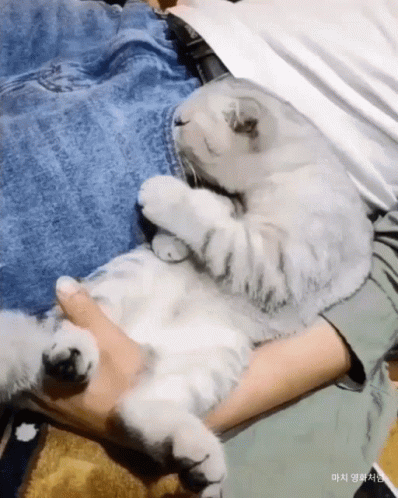 Paglalarawan ng Content: a cat laying on a person 's lap with a foreign language on the bottom right