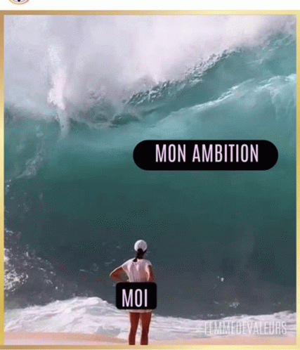 Paglalarawan ng Content: a woman standing in front of a large wave with a sign that says mon ambition on it