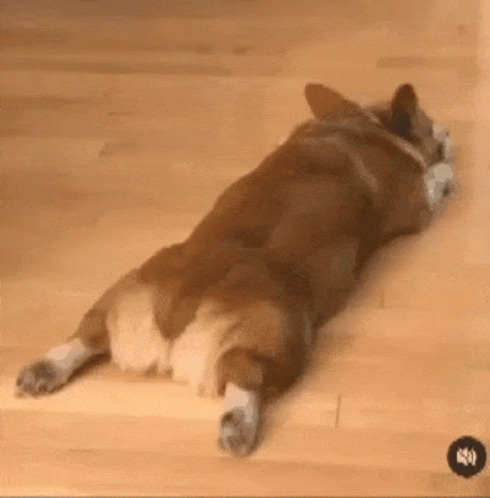 Paglalarawan ng Content: a corgi dog is laying down on its back on a wooden floor .