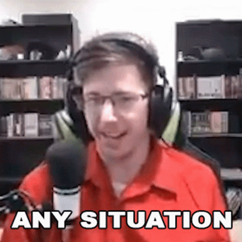 Paglalarawan ng Content: a man wearing headphones and a red shirt stands in front of a microphone with the words any situation below him