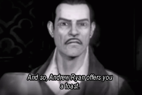 Paglalarawan ng Content: a black and white image of a man with the words " and so andrew ryan offers you a toast "