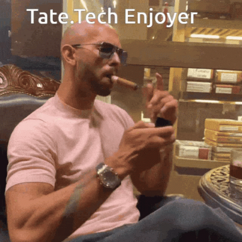 Paglalarawan ng Content: a man smoking a cigar with the words " tate tech enjoyer " below him