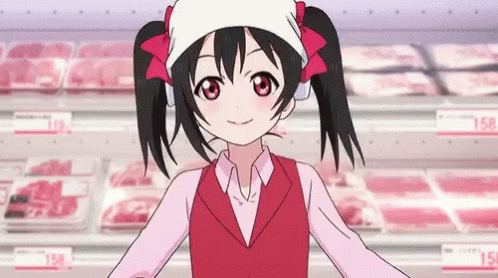 Paglalarawan ng Content: a girl with pigtails is standing in front of a display of meat in a store .