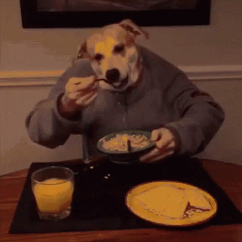 Paglalarawan ng Content: a dog is sitting at a table with a plate of food and a glass of orange juice ..