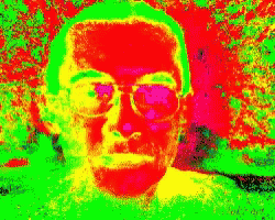 Paglalarawan ng Content: a close up of a man 's face with glasses in a colorful background