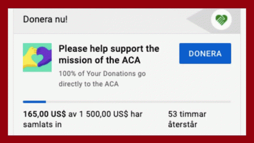- Paglalarawan ng Content: a screen that says " please help support the mission of the aca 100 % of your donations go directly to the aca "