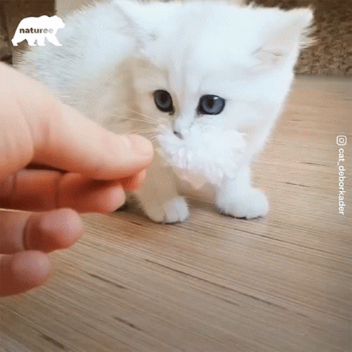 Paglalarawan ng Content: a white kitten is being petted by a person with a naturee logo in the corner