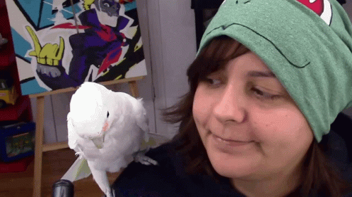 Paglalarawan ng Content: a woman wearing a green beanie looks at a white parrot on her shoulder