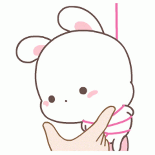 Paglalarawan ng Content: a cartoon rabbit is tied up with a pink string and a hand is holding it .