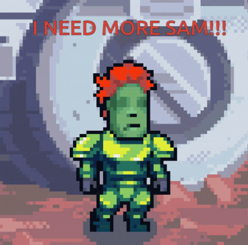 Paglalarawan ng Content: a pixel art of a man with red hair and the words " i need more sam " below him