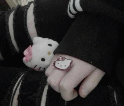 Paglalarawan ng Content: a person is holding a stuffed hello kitty and wearing a hello kitty ring .