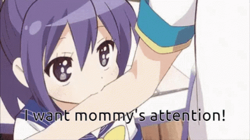 Paglalarawan ng Content: a girl with purple hair is holding her hand up and says `` i want mommy 's attention ! ''
