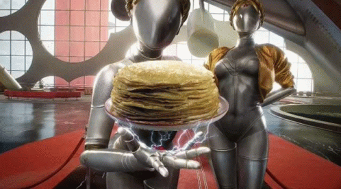 Paglalarawan ng Content: a robot is holding a plate of pancakes next to another robot .