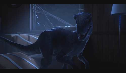 Paglalarawan ng Content: a blue dinosaur is standing in a dark room with its mouth open