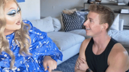 Paglalarawan ng Content: a man in a black tank top sits next to a drag queen on a couch