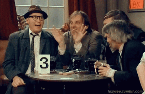 Paglalarawan ng Content: a group of men are sitting at a table with a sign that says 3