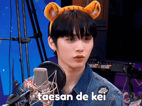 - Paglalarawan ng Content: a young man wearing a tiger ear headband stands in front of a microphone with the words taesan de kei below him