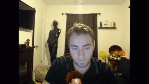 Paglalarawan ng Content: a man in a black shirt is looking at a doll in front of him