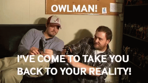 - Paglalarawan ng Content: two men are sitting on a couch with the words owlman i 've come to take you back to your reality written above them