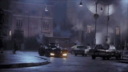 Paglalarawan ng Content: a batman car is driving down a dark street