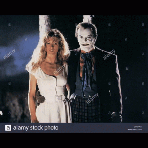 Paglalarawan ng Content: a woman in a white dress is standing next to a man in a joker costume