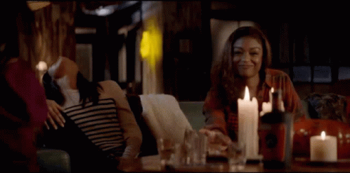 Paglalarawan ng Content: a woman sitting on a couch next to a table with candles and the word drank