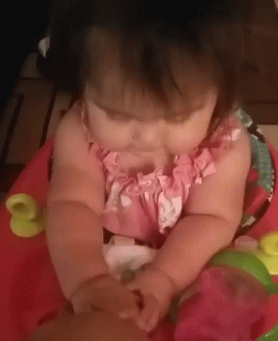 Paglalarawan ng Content: a baby in a pink dress is sitting in a red bouncer