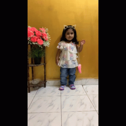 Paglalarawan ng Content: a little girl wearing a cat ear headband is standing in front of a yellow wall