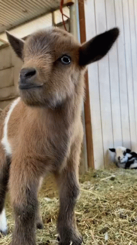 Paglalarawan ng Content: a small brown and white goat standing in a stable