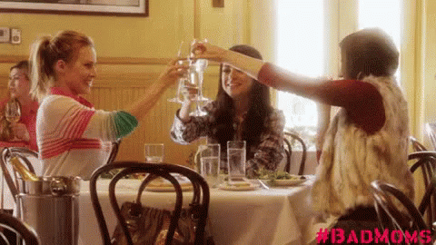 Paglalarawan ng Content: three women are sitting at a table toasting with wine glasses in a restaurant .