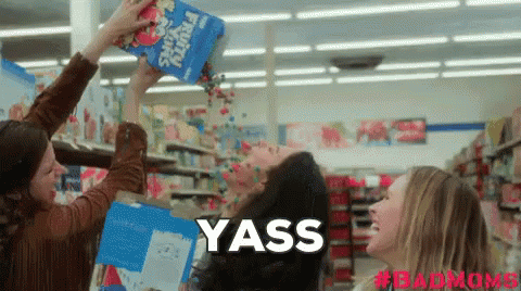 Paglalarawan ng Content: a woman is pouring a box of fruity pebbles into another woman 's mouth in a store .