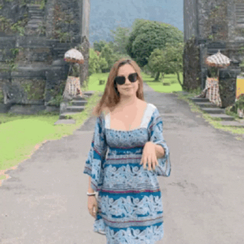 Paglalarawan ng Content: a woman wearing sunglasses and a blue dress stands in front of a gate