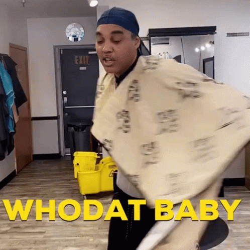 Paglalarawan ng Content: a man in a barber shop with the words whodat baby written on the floor
