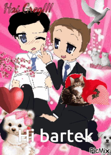 Paglalarawan ng Content: a picture of two boys and a cat with the words hi bartek on the bottom