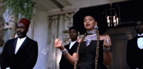 Paglalarawan ng Content: a woman in a black dress and a black hat is standing in front of a group of men in tuxedos .