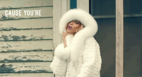 Paglalarawan ng Content: a woman in a white fur coat with the words cause you 're on the bottom right