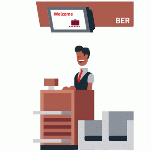 Paglalarawan ng Content: an illustration of a man standing at a counter with a welcome sign above him
