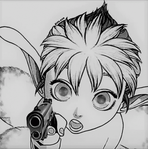 Paglalarawan ng Content: a black and white drawing of a girl pointing a gun at the camera with a caption that says blitz axe