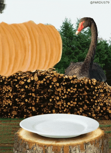 Paglalarawan ng Content: a black swan is standing next to a pile of logs and a large pumpkin