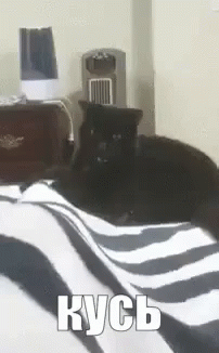 Paglalarawan ng Content: a black cat is laying on a striped blanket with the word kusb written on the bottom