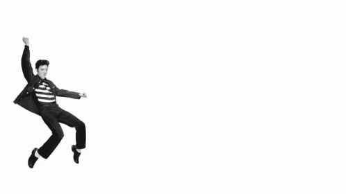 Paglalarawan ng Content: a black and white photo of elvis presley jumping in the air with the words vrij mi booo on the bottom