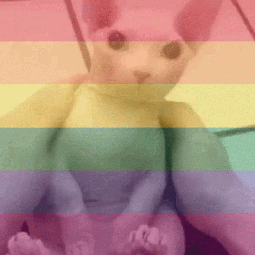 Paglalarawan ng Content: a cat is sitting on a person 's lap in front of a rainbow flag