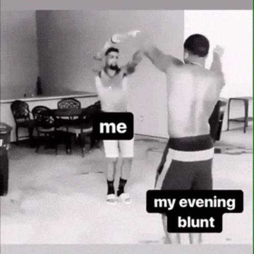 Paglalarawan ng Content: a black and white photo of two men dancing in a room with the caption `` my evening blunt '' .