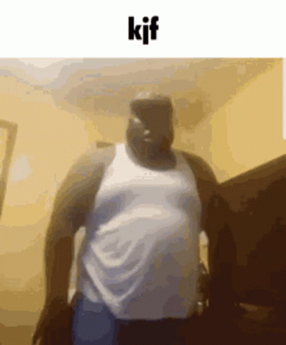 Paglalarawan ng Content: a man in a white tank top is standing in a room with the word kif written on the bottom .